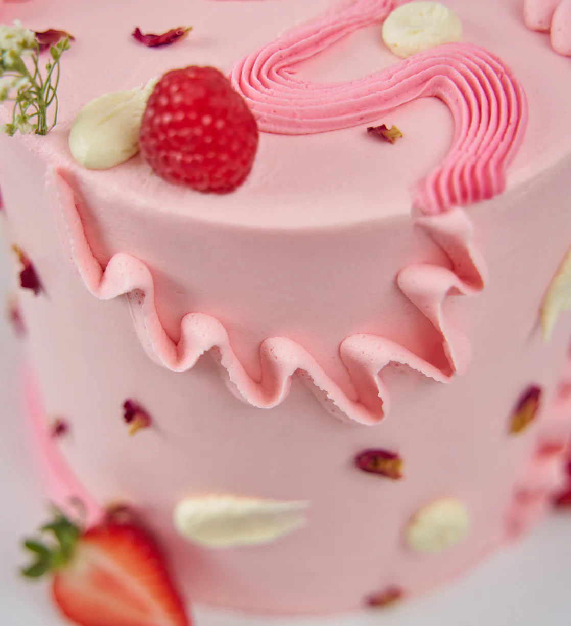 Embrace the abstract with this simply stunning Pink 'Chaos Cake'. Decorated with playful swirls of pink vanilla buttercream, as well as an assortment of fresh fruit and delicate edible flowers.