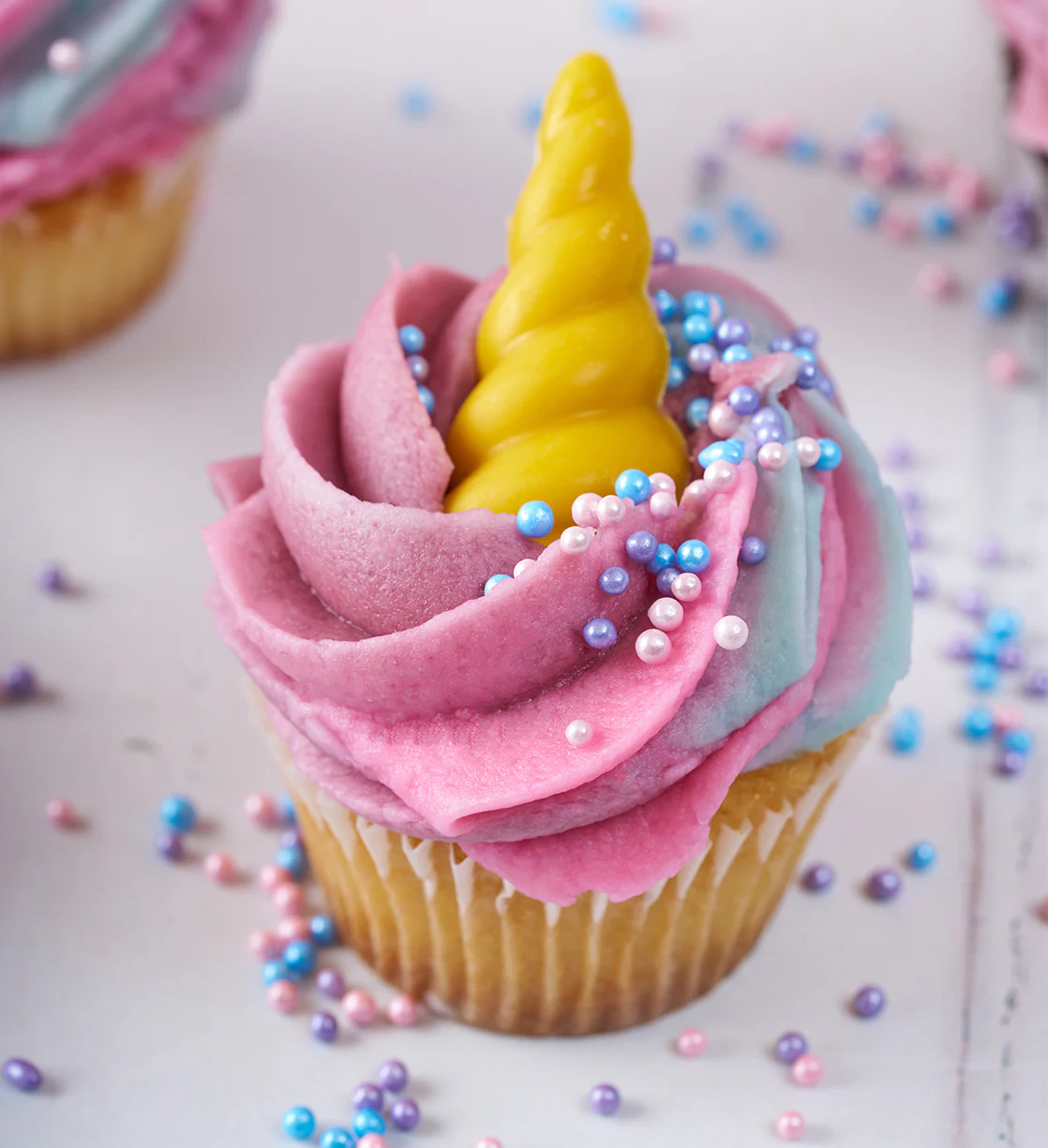 As delicious as they are colourful and bright! Freshly baked sponges swirled with buttercream, adorned with sprinkles, smarties and mini sweets.